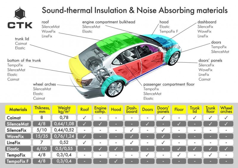 CTK Premium ir viens no vismodernākajiem pašlīmējošajiem pretvibrācijas materiāliem tirgū, pamatojoties uz vismodernāko augstas kvalitātes butilgumijas kompozītmateriālu, īpaši polimēri un pastiprināti ar 100 mikronu biezu (0,1 mm) reljefu alumīnija folija, kas vēl vairāk uzlabo akustiskās īpašības. Šis materiāls ir ko raksturo ļoti augsta vibrāciju slāpēšana (absorbcija) plašā diapazonā temperatūra, augsta elastība, ļoti augsta viskozitāte un saķere ar virsmu. Plkst tajā pašā laikā salīdzināmā amortizācijas un vibrācijas efektivitātes (MLF) diapazonā, CTK Premium amortizācijas paklāji ir viens no vieglākajiem pretvibrācijas materiāliem tipa, ražots Eiropā. Plānāka un līdz ar to vieglāka CTK Premium izmantošana paklājiņi ļauj samazināt vibrācijas un troksni līdz tādam līmenim, kāds būtu citādi tas būtu sasniedzams ar citiem mazāk tehnoloģiskiem materiāliem, kas ir daudz lielāki biezums un daudz lielāks svars. CTK vibroakustiskie materiāli no Premium sērijas produkti ir īpaši paredzēti profesionāliem uzstādītājiem pazīstamu uzņēmumu automašīnu audio aparatūru.